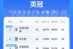 目前米德尔斯堡迎来六连胜,31轮18胜7平6负积61分,以2分优势领跑英冠。兰帕德执教的考文垂近3轮2负1平,31轮积59分第二。