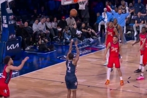而在上一场世界队加时35-37惜败美国新星队的比赛中,巴恩斯弧顶接球迎着文班命中也同样命中绝杀!